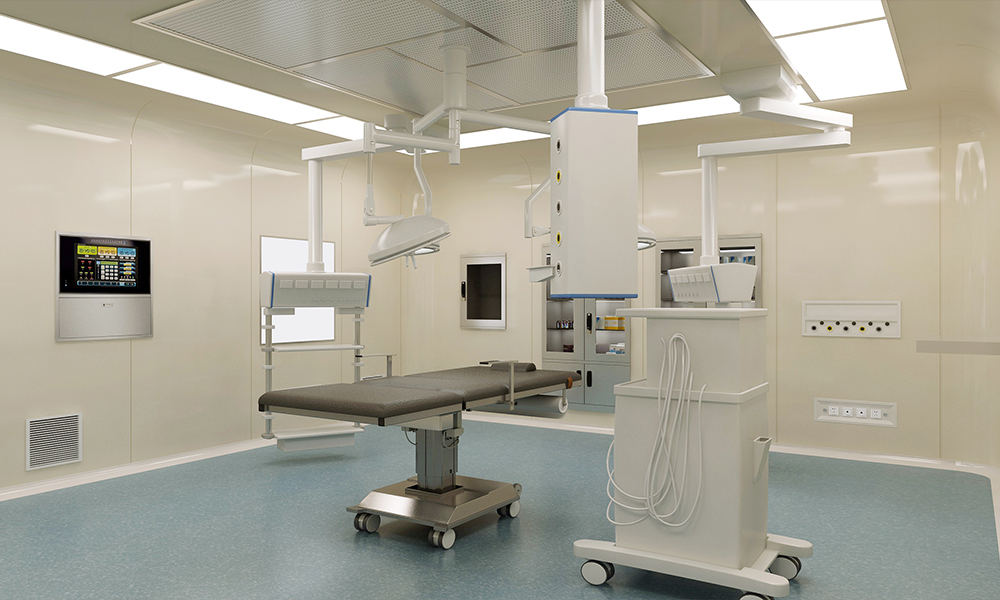 一般洁净手术室:空气通过初效、中效、高效过滤器经房间天花上的非诱导型送风装置进入手术间,洁净空气将室内的污染空气从回风口推出,使手术室内始终保持洁净状态。