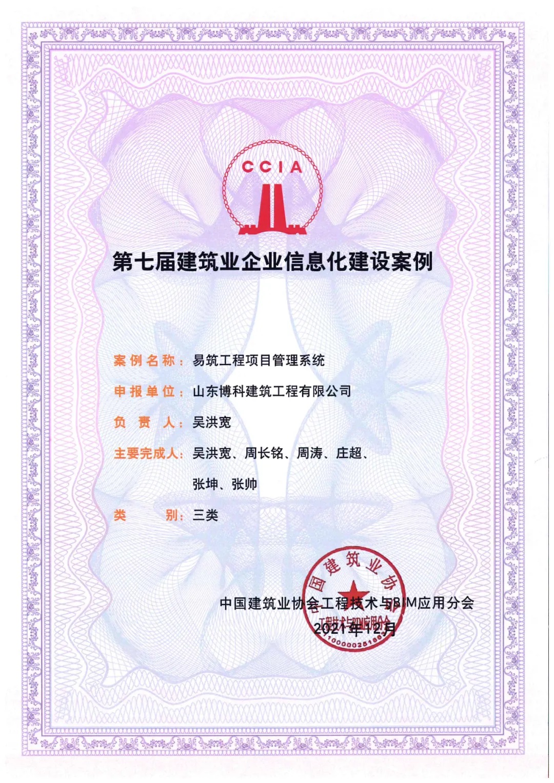 近日,由中国建筑业协会举办的“第七届建筑业企业信息化建设案例征集活动”结果公布,博科建筑申报的《易筑工程项目管理系统》获“三类案例”,被作为优秀案例在行业学习借鉴。